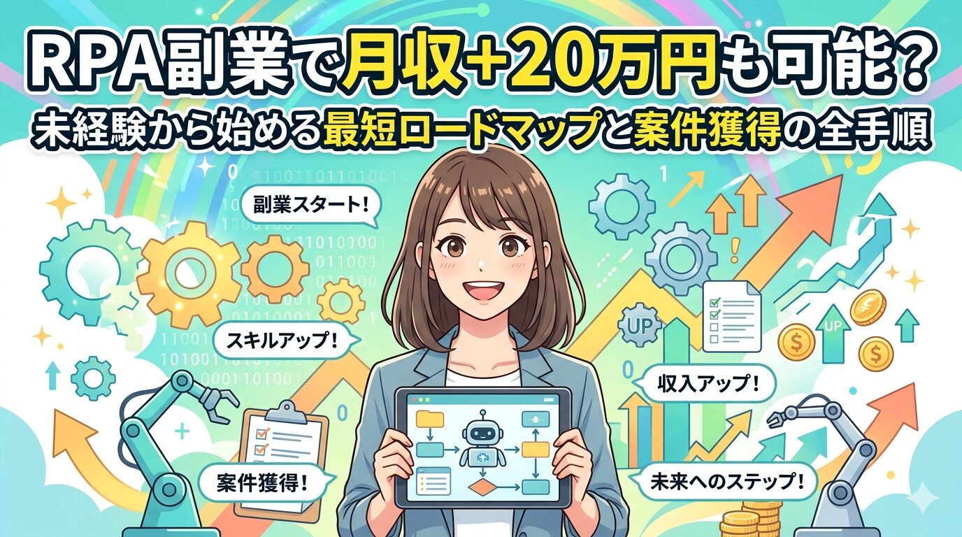 「RPA副業って実際どうなの?」そんな疑問に、現役システムPMが本音で答えます。未経験からの学習方法・単価相場・案件獲得ステップ・リスク管理まで、会社員が安全に始めるための全手順を徹底解説。時給2,000円→6,000円を実現した実体験をもとに、あなたの「一生モノの武器」の作り方を紹介します。