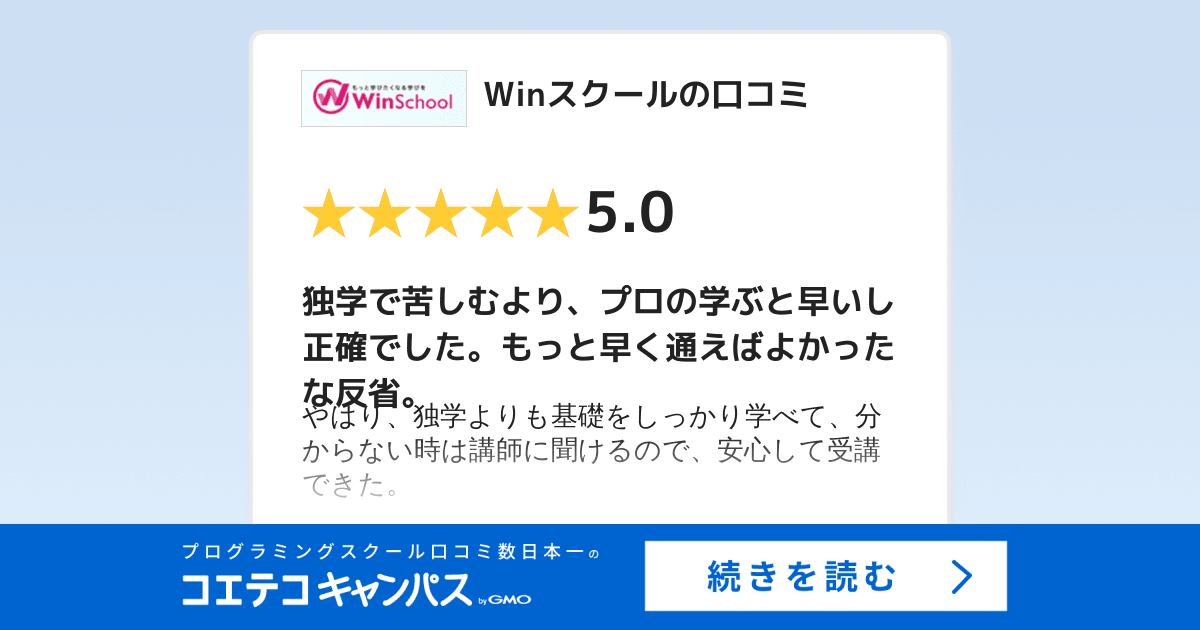 過去に独学でつまずいた経験がある、エラー解決で時間を溶かしたくない、という方には、現役プロがマンツーマンで横につくWinスクールが最適です。