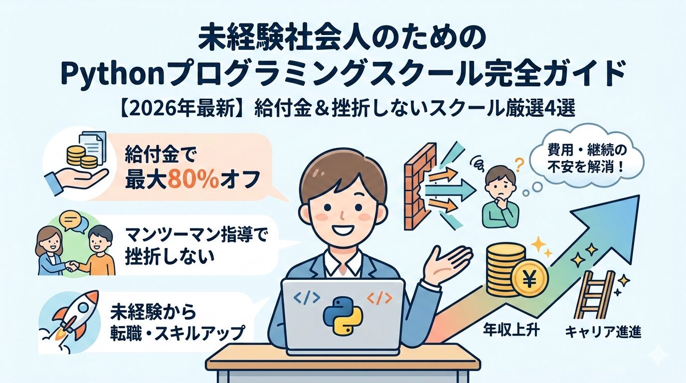Pythonプログラミングスクールおすすめ4選【2026年最新】給付金で最大80%オフ・挫折しないマンツーマン指導で選ぶ未経験社会人の完全ガイド